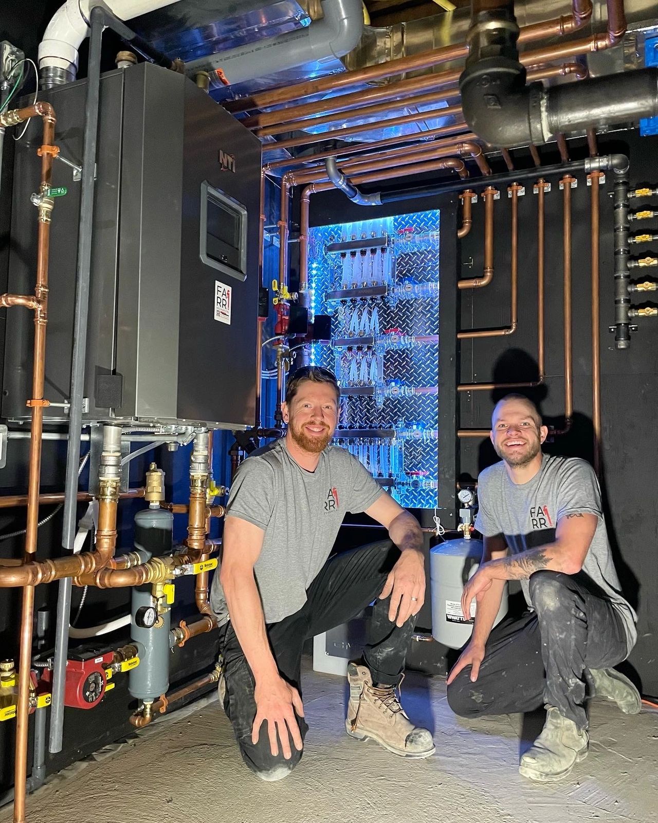 Spanning all 4 walls of this mechanical room, we have an NTI Boiler supplying heat for snowmelt, an indirect water heater, basement in-floor heat, garage in-floor heat and pool heat. Additionally, separate from the hydronic system, we installed a 3-zone forced air duct system with a gas furnace and a 5-stage air conditioner.
