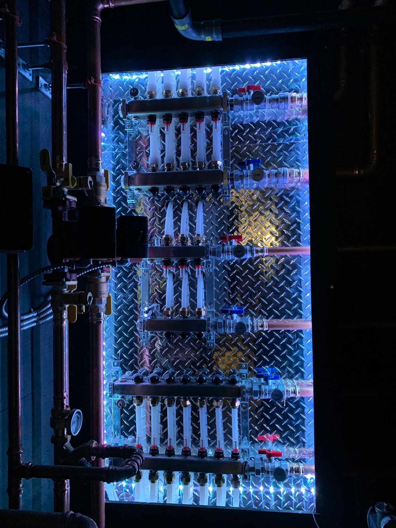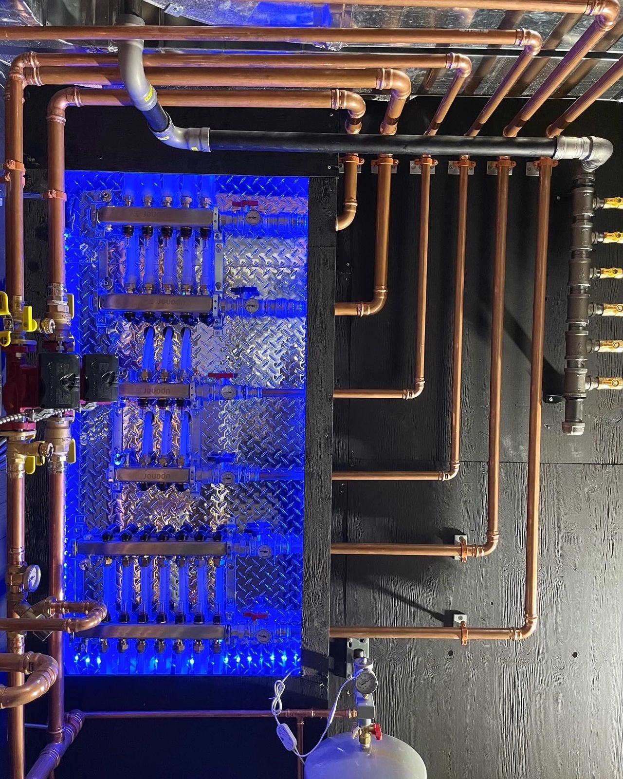 This system is one of our favourites due to its unique, eye-catching features. Running the boiler and gas piping along the ceiling and all 4 walls created more of a 3D feel than a typical system which normally spans a single wall. The recessed, LED-lit manifold wall added to the experience. Touring this room felt like entering a whole different world!